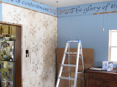 The stenciling had been a labour of love. I photocopied a favourite font in magnification, cut each letter into mylar and then the tedious job of measuring it all out and painting. I often wondered what dinner guests thought of this stenciling on our walls. This week when we started the reno job it really struck me that if you asked me to quote this poem for memory I couldnβt do it.Β Familiarity with your surroundings.Β Now that we are ripping it down Iβm going to miss it. I suppose I could paint it again once the new drywall is finished. But thatβs not something I desire to do. Our home has itβs own voice.