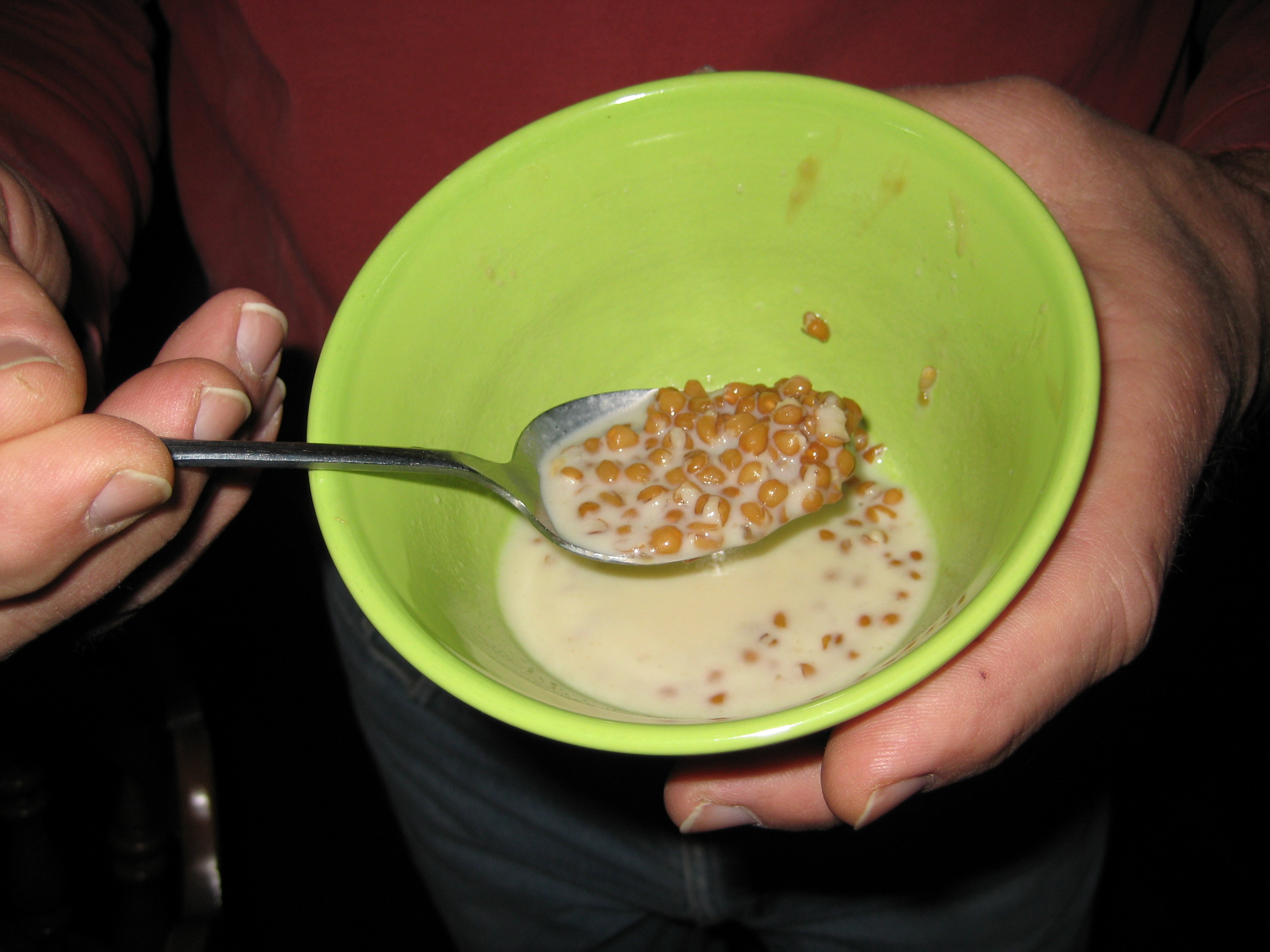 Served with heaps of brown sugar and, during his childhood, fresh cream. He loaded up a huge bowlful.