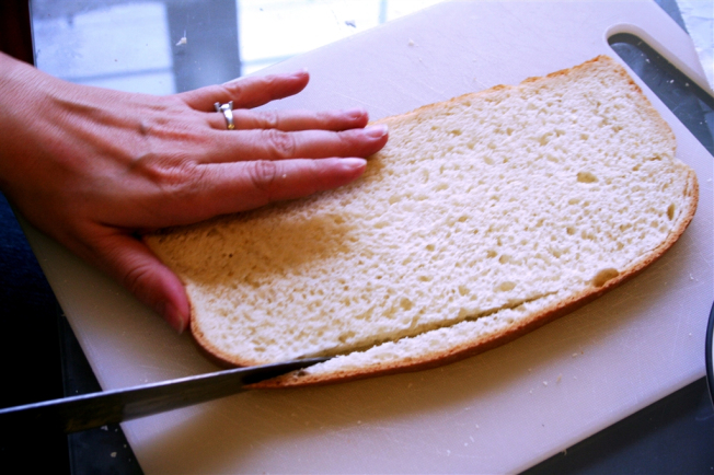 First, days in advance, she had to special order the bread, an LARGE unsliced loaf. Then have them put it through the mechanical slicer sideways.