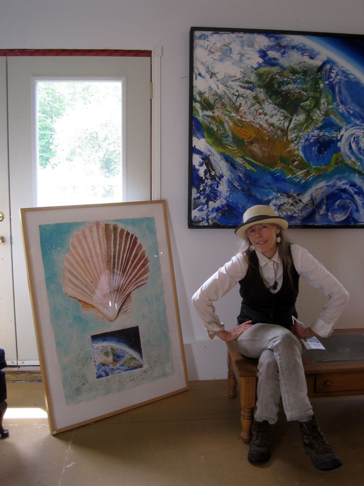 Being welcomed into her studio is like walking into her brain.ย Works in progress, finished pieces, shadowboxes from long ago, cards, books, pieces ofย her husband’s pottery,ย her daughter’s art.