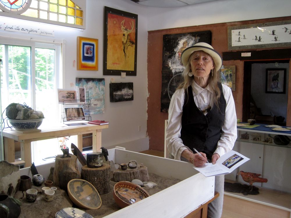 My husband and I had perhaps 3 hours to putz around Manitoulinย Islandย enroute to the West. ย We could swing into the hamlet of M’Chigeeg to seeย Neon Raven Gallery. So we followed the lively little signsย โThe Heart of the Artโ from the ferry dock. Pulling up the driveway, past the vegetable garden, the banks of solar panels and sighting anย adobe-style home and studioย I said to myself, “this oughta be interesting.” Out popped a lively hippie woman and said, “I thought you might be my daughter, she’s supposed to be here any minute with my grandchild.”