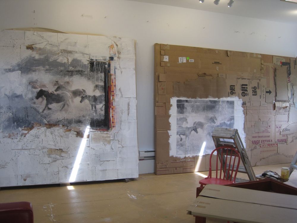 It felt like I was experiencing aย remnant from another decade. But her art is far from an environmentalist flower child’s meanderings.ย We were quickly immersed in her vortex of creativity. Currently she is working on large mixed media paintings in corrugated cardboard, found pieces (AKA trash) and photo transfers with acrylic for an upcoming show.