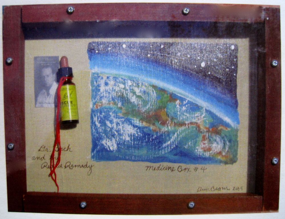 Her explanation of this painting/collage “Wheel” was that she saw a nine pointed star in the bicycle wheel. The Buddha (it could have been any deity, but that’s the one she chose, even though she’s not a Buddhist she said) is showing us how to sit in a relaxed way, showing us that we all can relax.