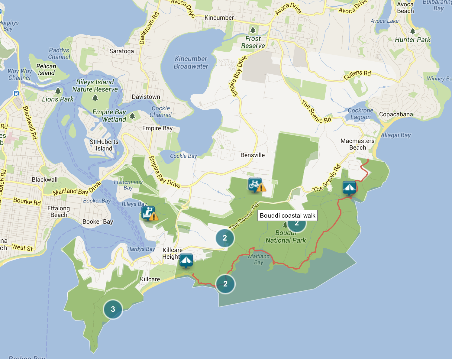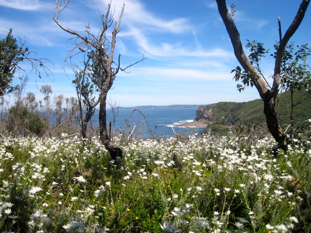 The walk down to Maitland Bay beach, 195 metres is through rugged gullies, dry eucalypt forests,Β gum trees, emerging spring flowers, and bottle brush bushes of all types.