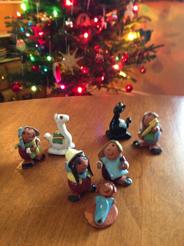 Today I unwrapped my teeny creche scene and set it up. Little clay figurines I bought in Bolivia. Little alpaca shepherds wearing traditional knitted alpaca toques with earflaps and playing their zampogna (panpipes). Β Mary wearing a traditional women’s boler hat.