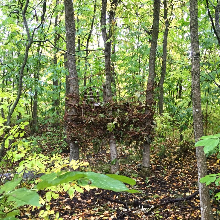 Another offering in the woods. I found some nice green grapevine. Green vine is easy to weave, leaves and all. When I find a pile of grapevine I interpret it as a free art supply, just waiting for a challenge.