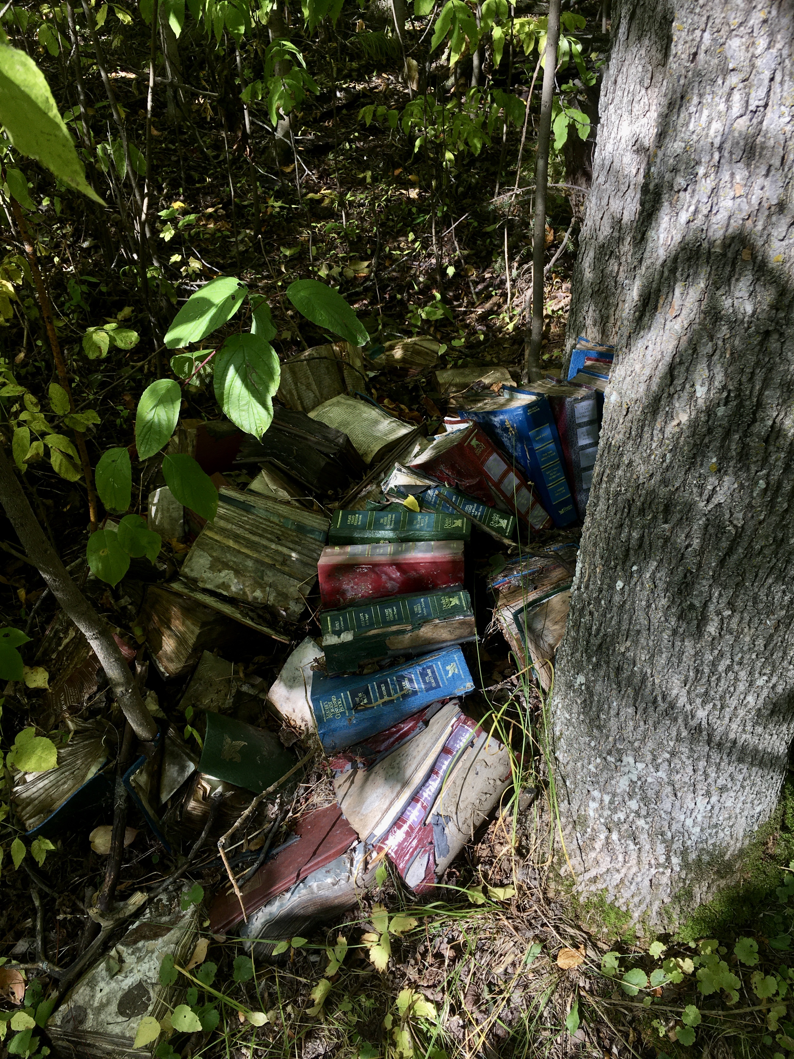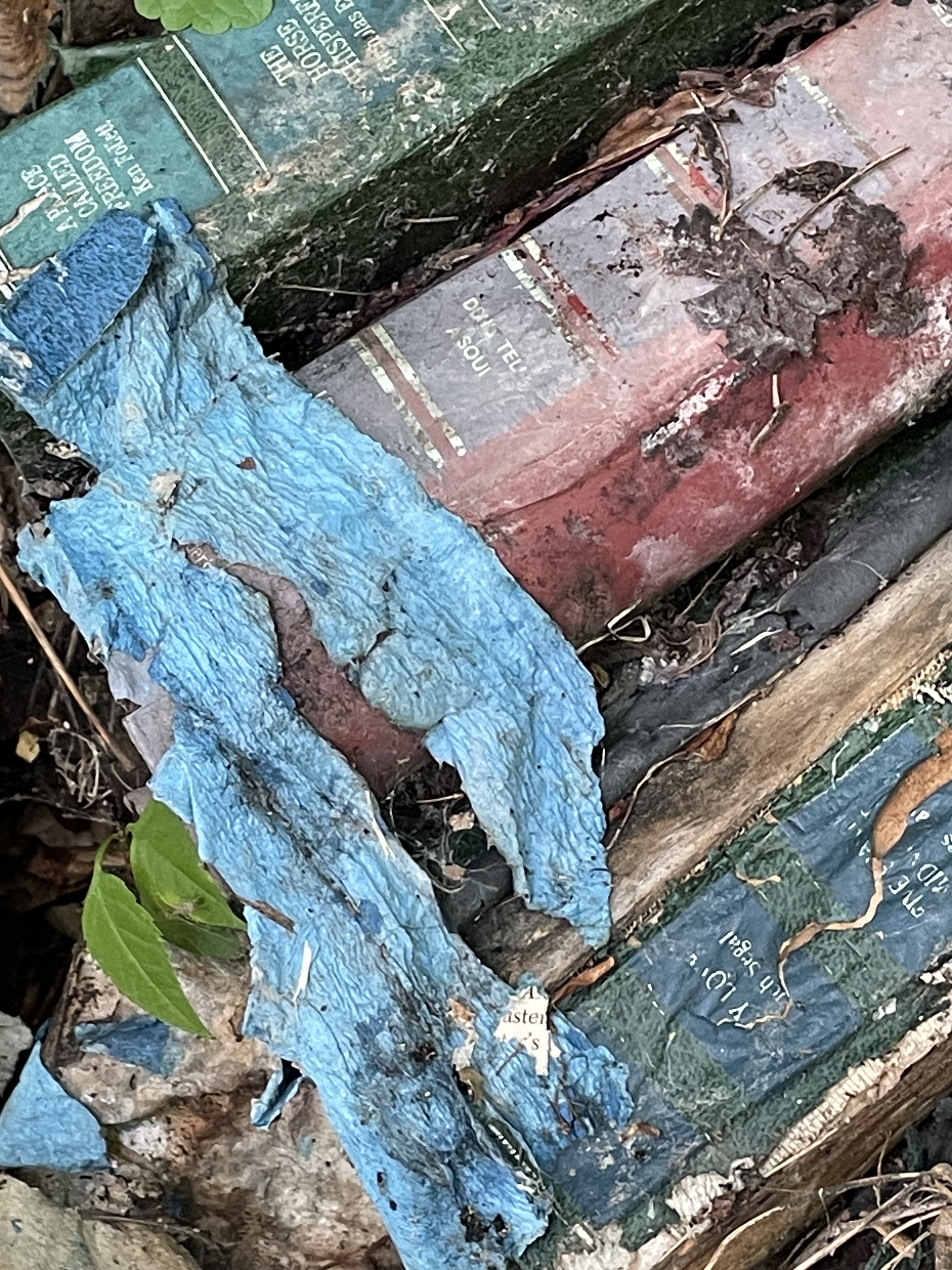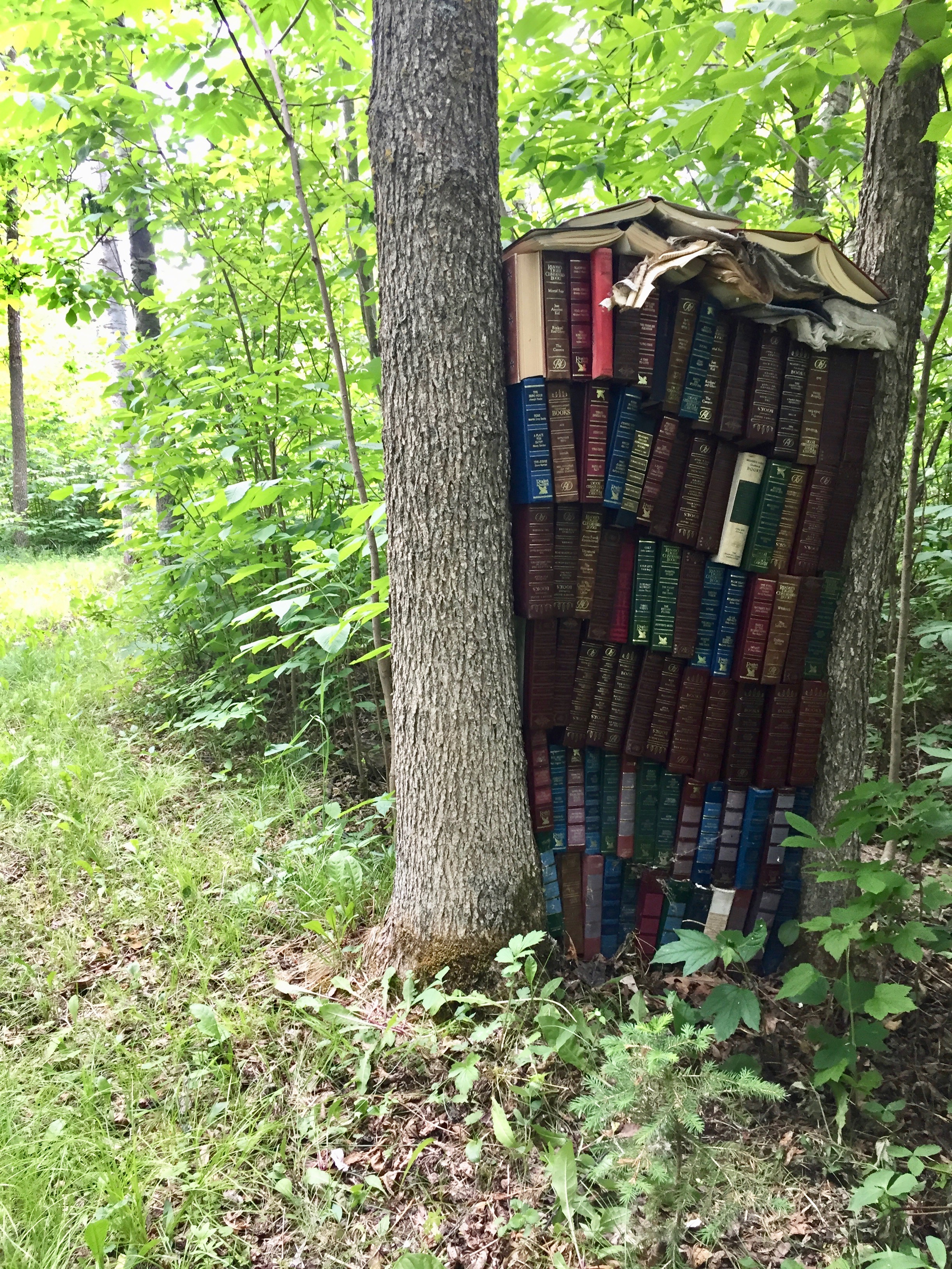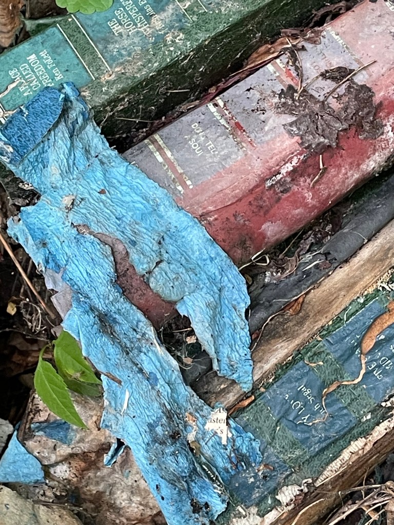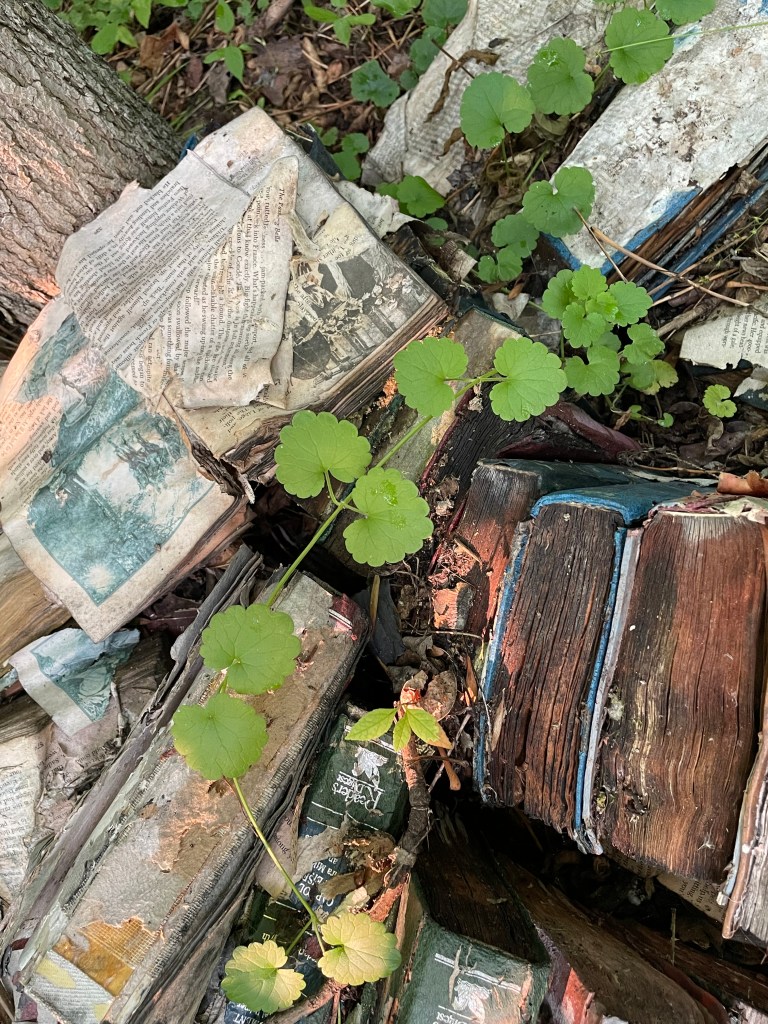 I have been inspired to do odd stuff with old books by @book_ronnie on Instagram. She leaves books in piles or assemblages in the woods and waits to see what will happen to them.
