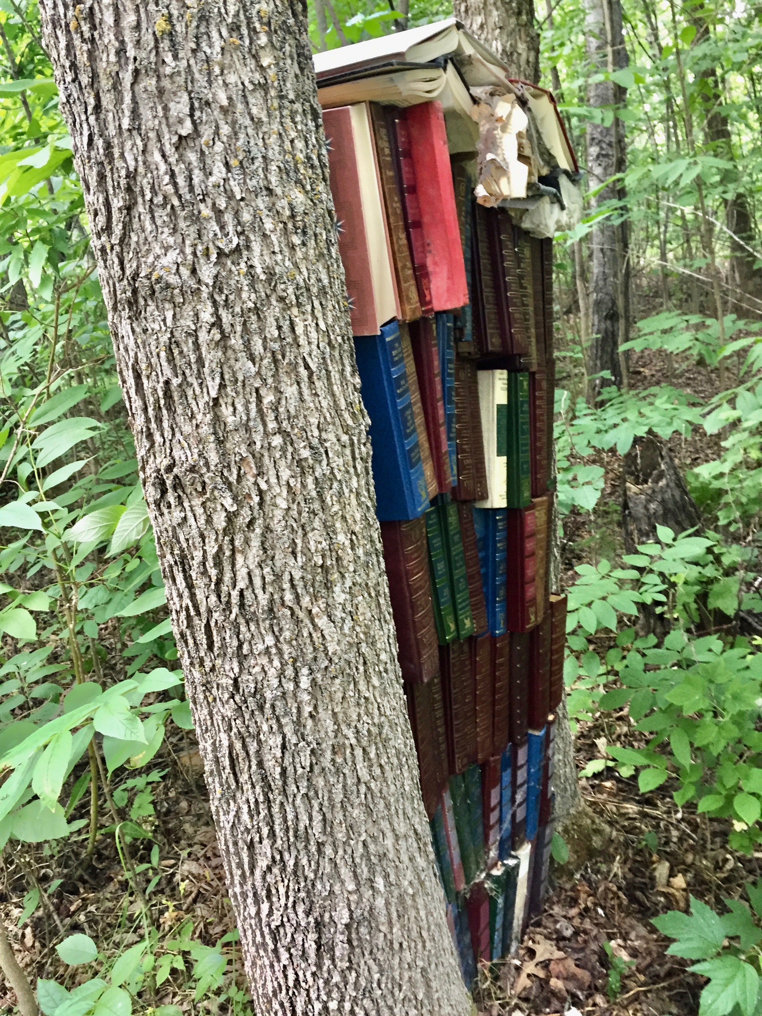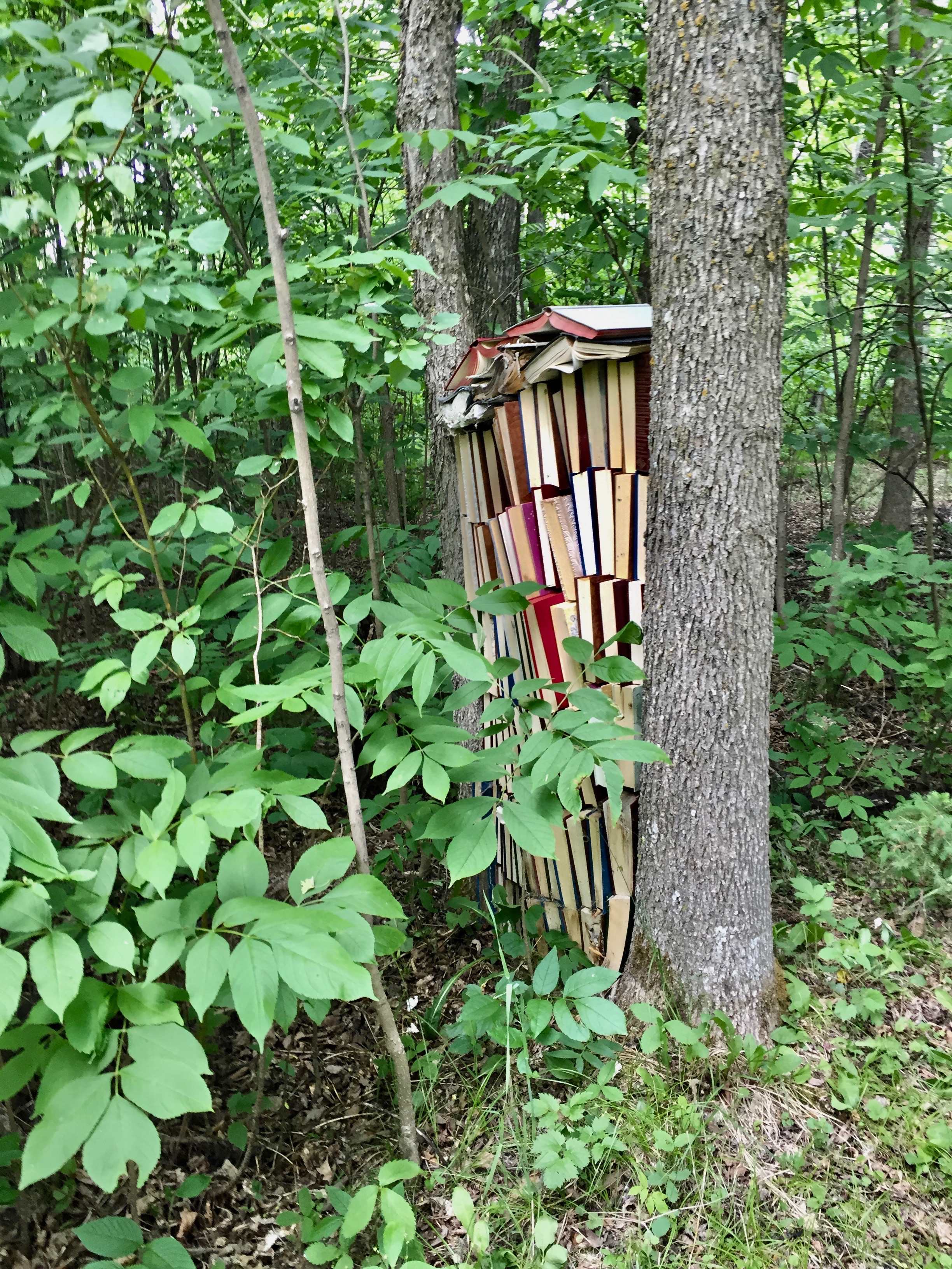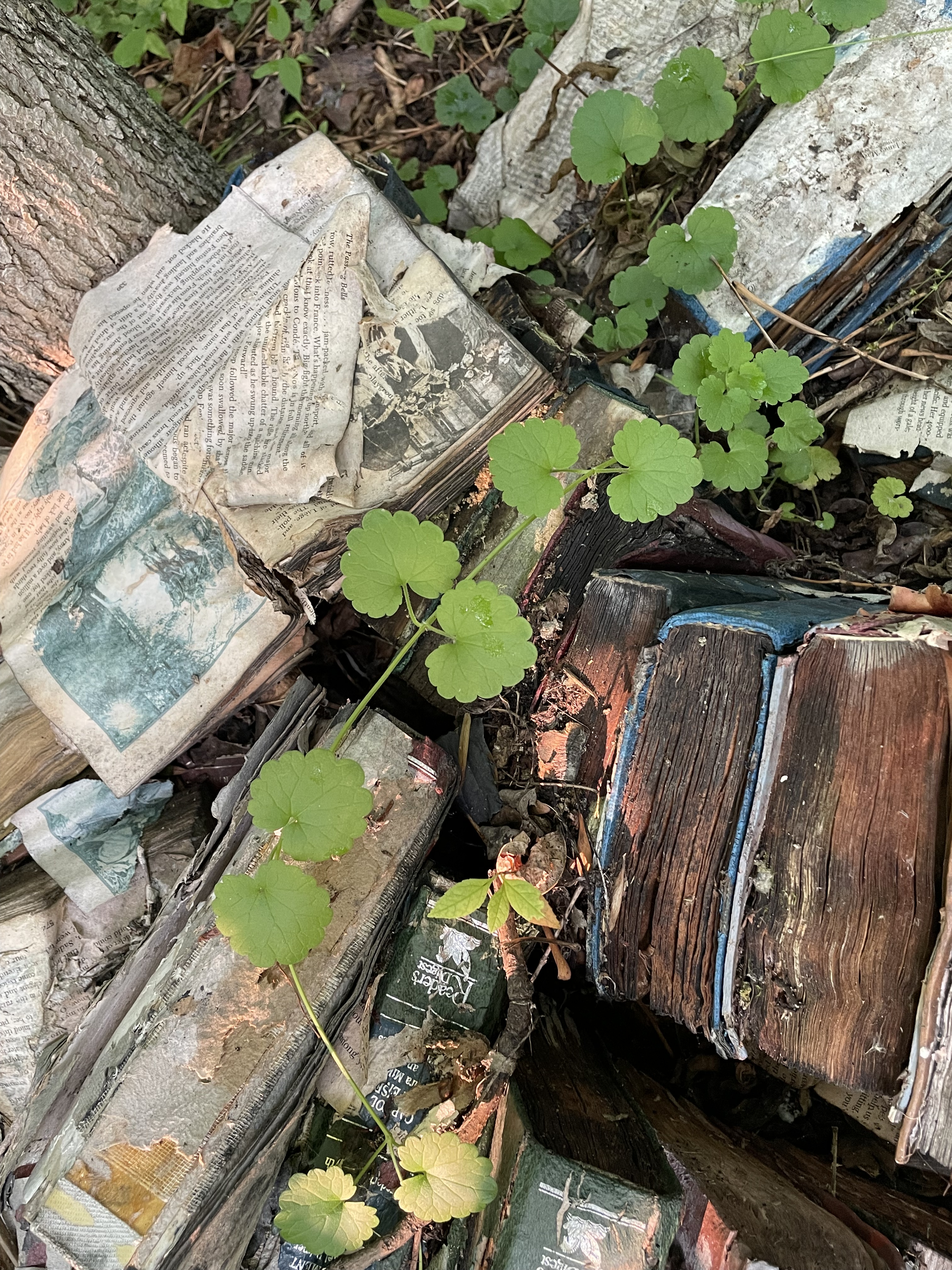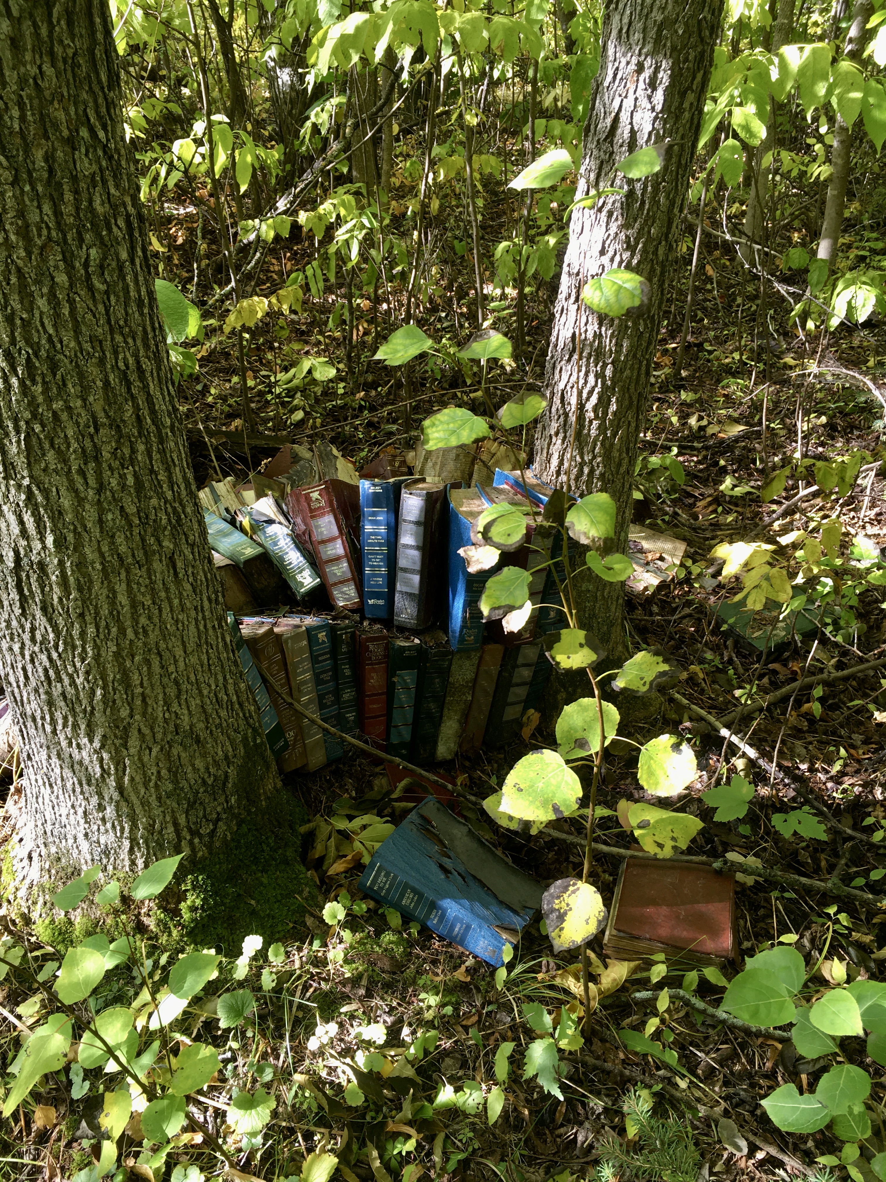 I have been inspired to do odd stuff with old books by @book_ronnie on Instagram. She leaves books in piles or assemblages in the woods and waits to see what will happen to them.