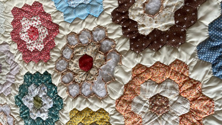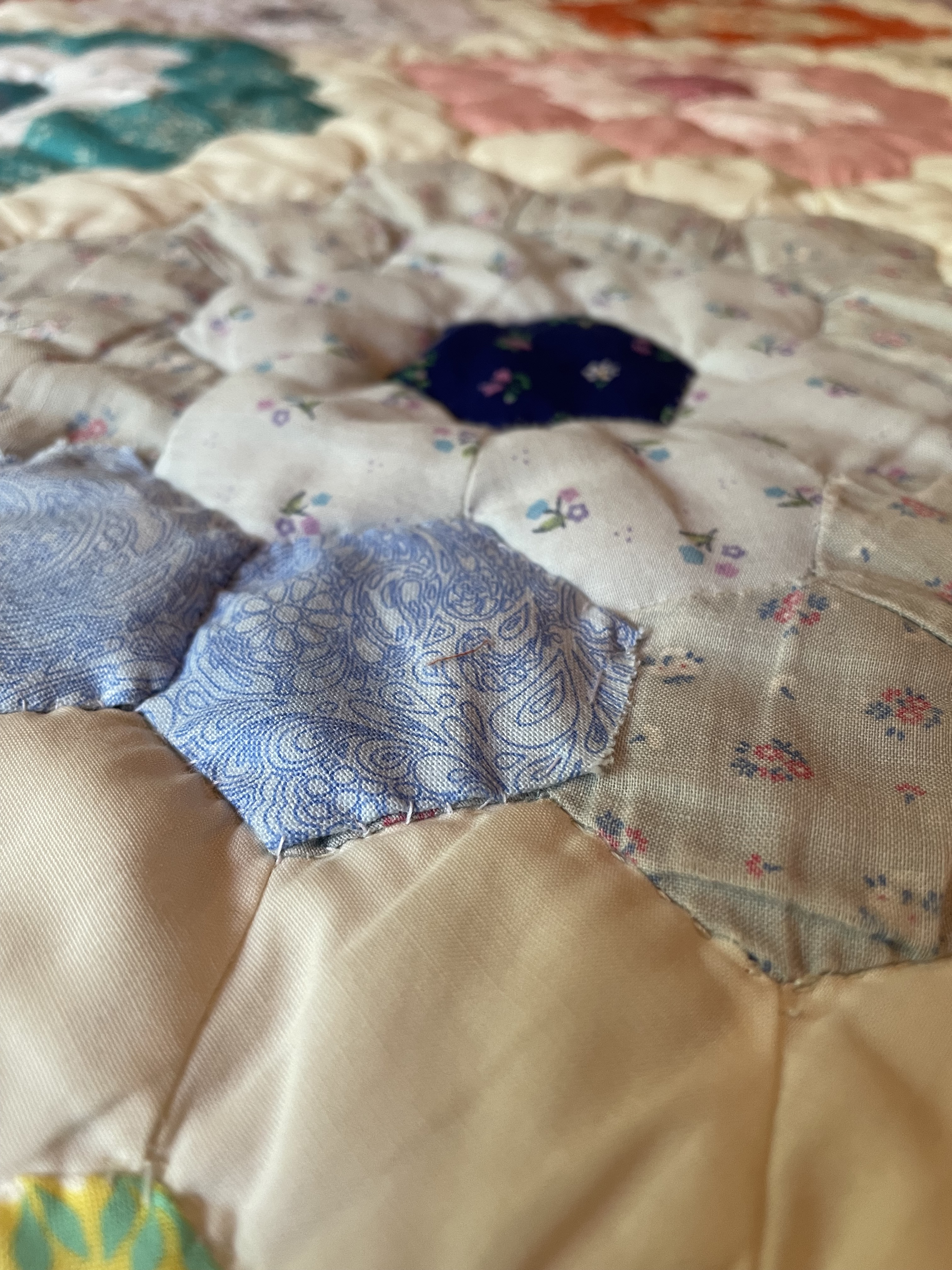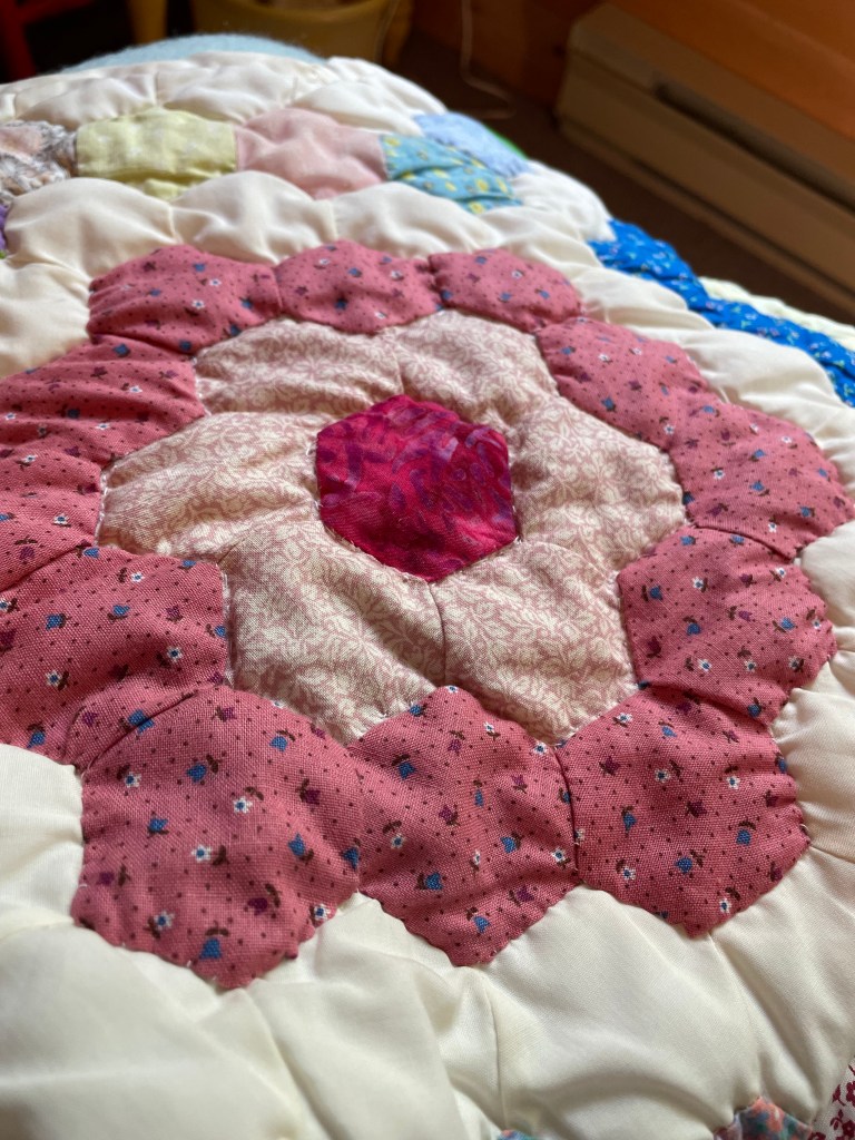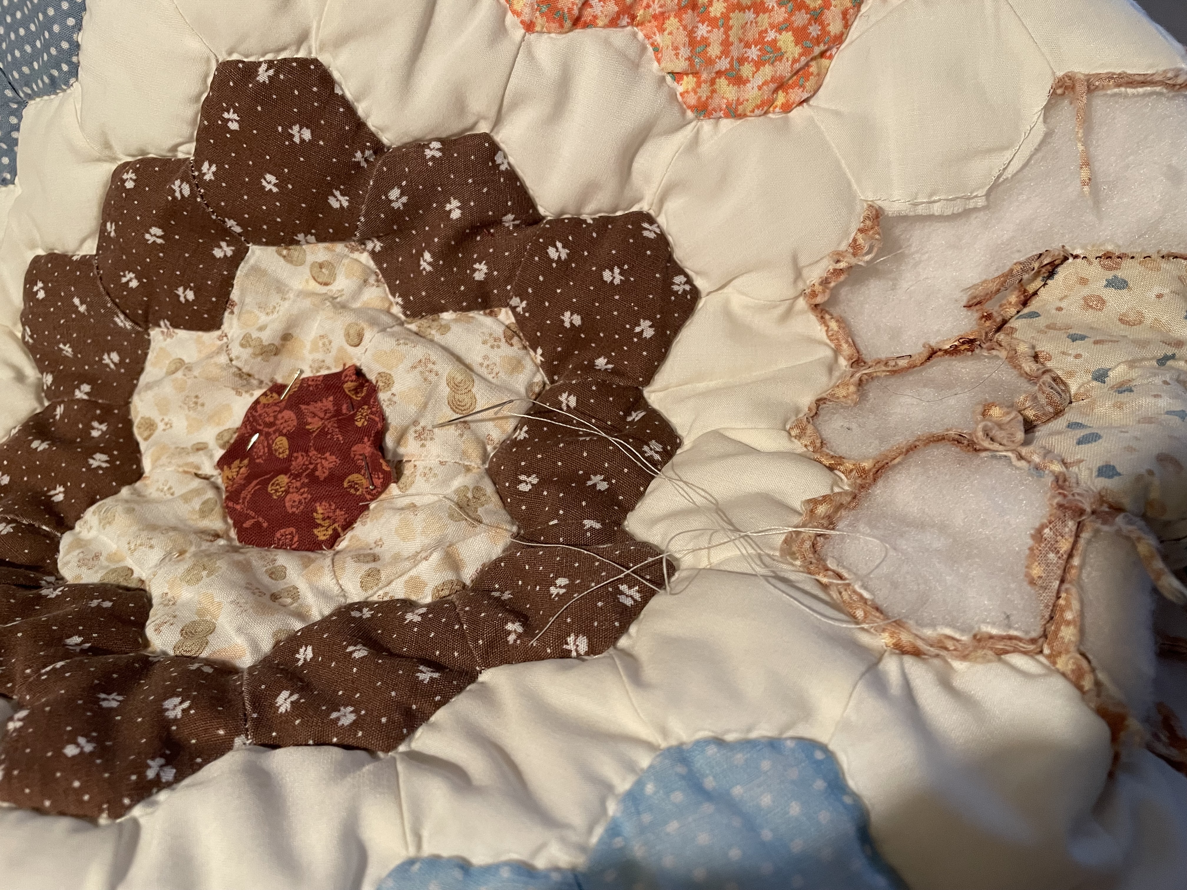 The process of rejuvenating, repairing and revisioning my old quilt, which actually won a First Prize ribbon in the Enniskillen Fall Fair in 1992, has been fascinating and rewarding. Somehow it seems appropriate and timely that I took on this deconstruction/reconstruction project while concurrently writing a diary/memoir about my great-mother, Sarah Margaret Williams Harris. A Grandmother’s Flower Garden quilt is featured in my book. The mending has felt like a repairing of the past, for me and her. As Monk Kidd says, “𝑆𝘰𝑚𝘦ℎ𝘰𝑤 𝑠𝘩𝑒 𝑠𝘦𝑒𝘮𝑒𝘥 𝘮𝑜𝘳𝑒 𝑡𝘩𝑎𝘯 𝘮𝑦 𝑑𝘢𝑢𝘨ℎ𝘵𝑒𝘳; 𝑠𝘩𝑒 𝑤𝘢𝑠 𝑚𝘺 𝘮𝑜𝘵ℎ𝘦𝑟, 𝘮𝑦 𝑔𝘳𝑎𝘯𝑑𝘮𝑜𝘵ℎ𝘦𝑟, 𝘢𝑛𝘥 𝘮𝑦𝘴𝑒𝘭𝑓.” The book writing is an internal mending for my daughter, myself, my mother, my grandmother and all the grandmothers of my Harris family tree. It is a rich heritage garden from which I grew.