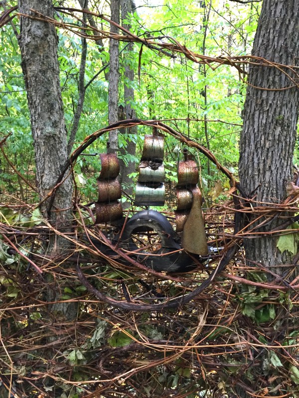 Another offering in the woods. I found some nice green grapevine. Green vine is easy to weave, leaves and all. When I find a pile of grapevine I interpret it as a free art supply, just waiting for a challenge. I featured an old clock, minus the mechanical parts, in this weaving. It has metal... Continue Reading →